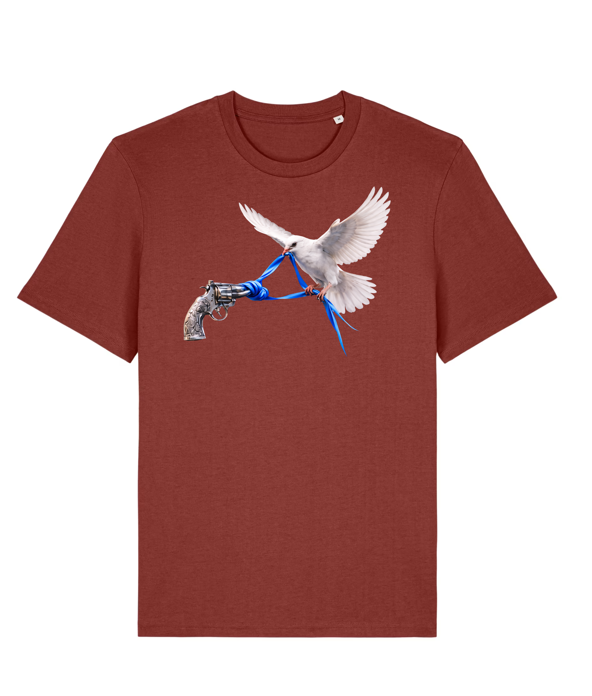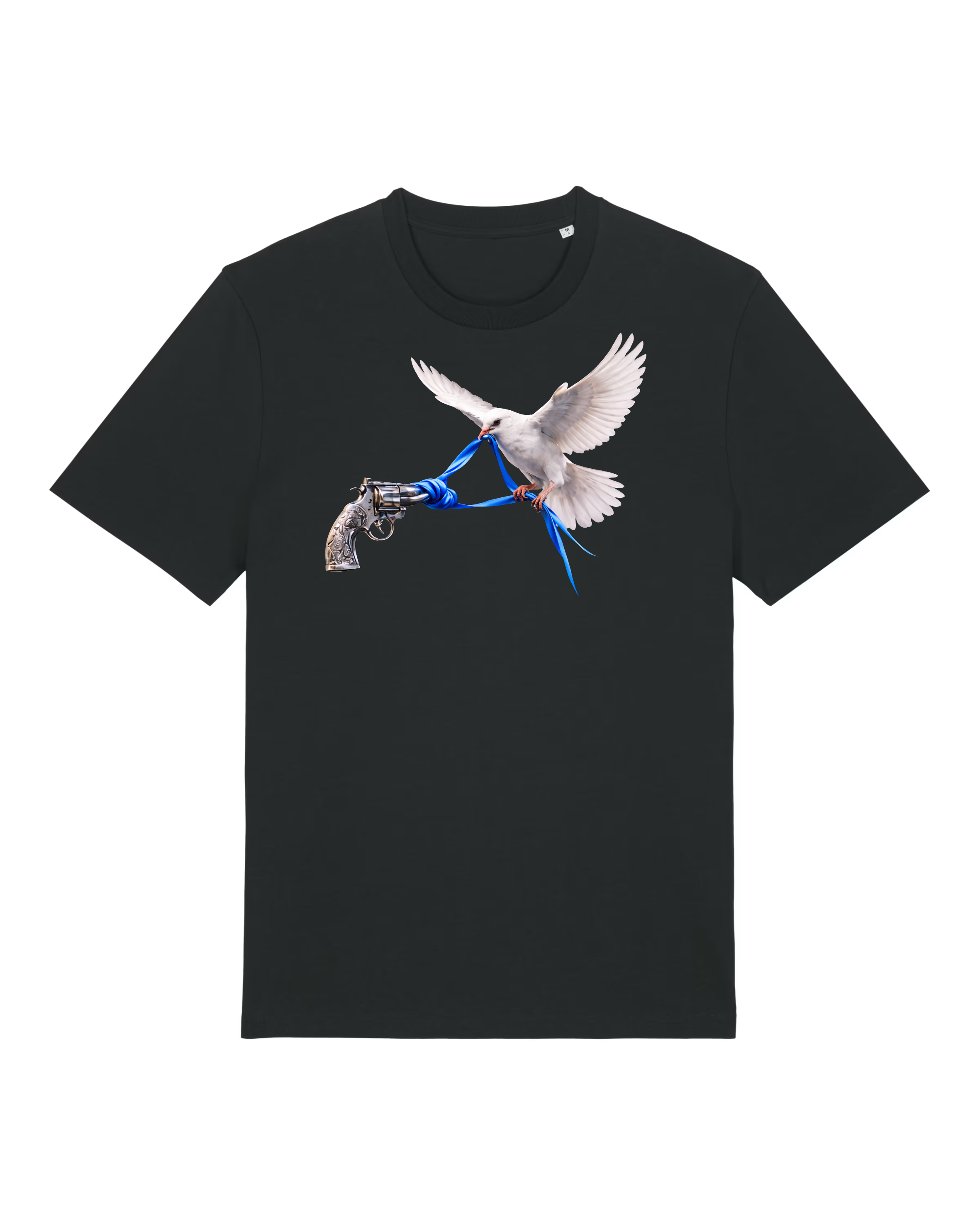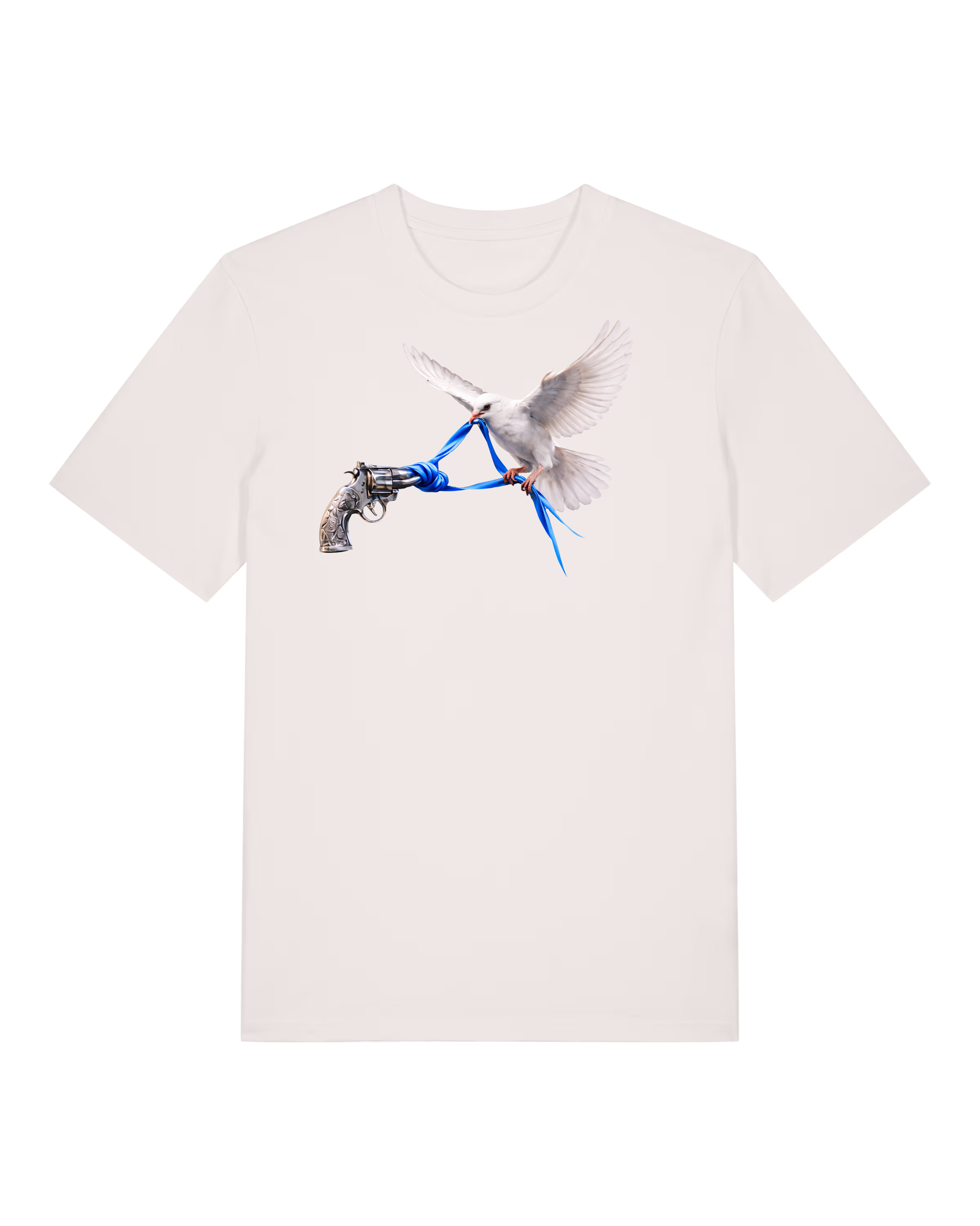 Die weiße Taube, ein universelles Symbol für Frieden, entwaffnet die Waffe mit einem blauen Band. Ein kraftvolles Motiv das zeigt, das Hoffnung, Mut und Menschlichkeit immer einen Weg finden können.